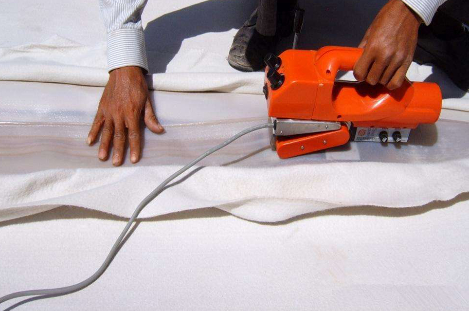 在垃圾場邊坡鋪設(shè)土工膜時,先把土工膜從事先確定好的位置平行于坡度線鋪設(shè),順次鋪設(shè)的土工膜,相鄰兩片土工膜搭接 100-120mm(根據(jù)所用焊接機(jī)不同,搭接寬度也會有差異,如:瑞士產(chǎn)的LEISTER6C型熱楔焊接機(jī)(?。┐罱訉挾葹?00mm,瑞士產(chǎn)的LEISTER ASTRO 熱楔焊接機(jī)(大)搭接寬度為120mm,美國產(chǎn)的WEDGEIT 2000型熱楔焊接機(jī)搭接為120mm,德國產(chǎn)的GEOWELD PLUS熱楔焊接機(jī)搭接為120mm。)