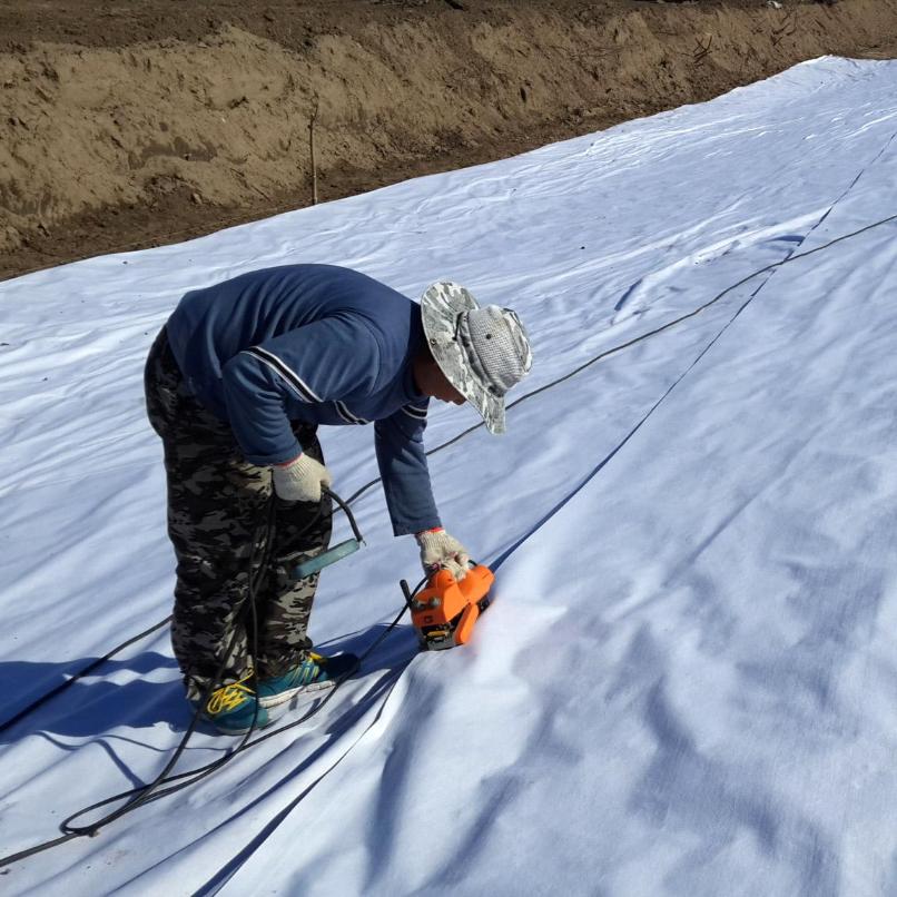 7.為防止大風(fēng)吹損,在鋪設(shè)期間所有的復(fù)合土工膜用沙袋壓住,直至90cm土工膜覆土施工完為止。朔州為十燥多風(fēng)天氣,幾乎每天都有風(fēng),所以當(dāng)天鋪設(shè)的復(fù)合土工膜在當(dāng)天必須焊接完成,防止夜間大風(fēng)造成不必要破環(huán)。